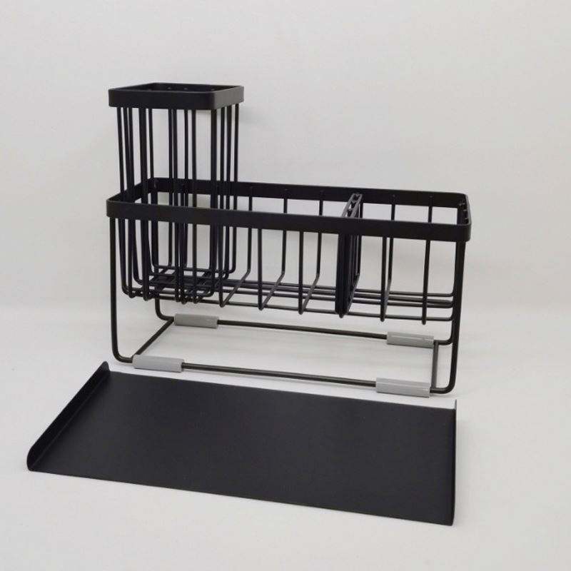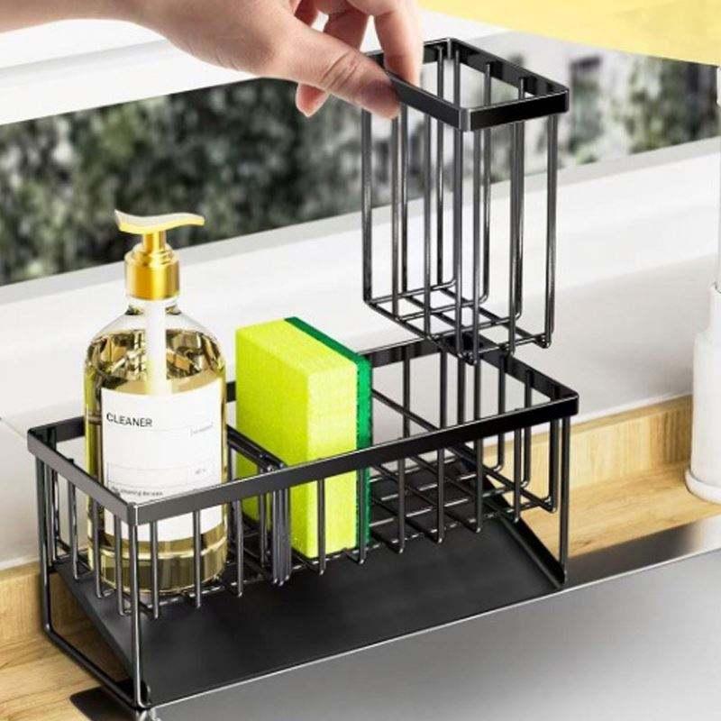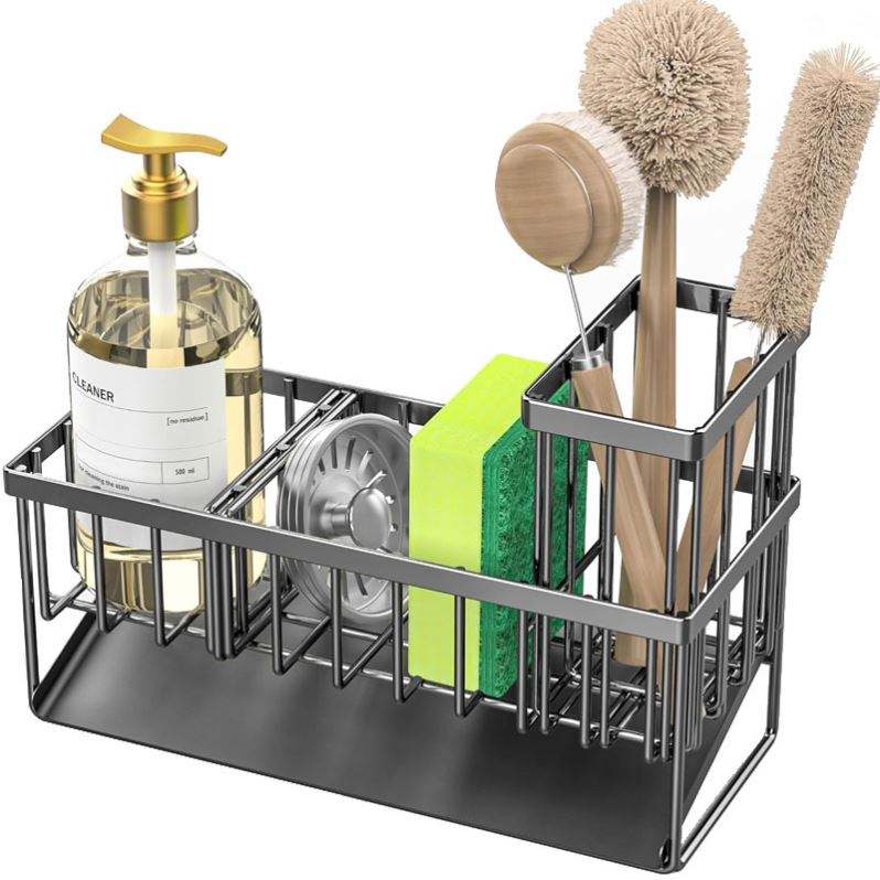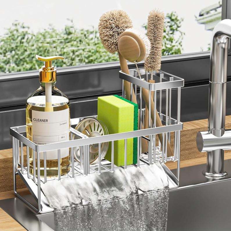 Organisateur de salle de bain et cuisine avec distributeur de savon, porte-éponge et plateau de drainage amovible pour accessoires de maquillage et de lavabo
