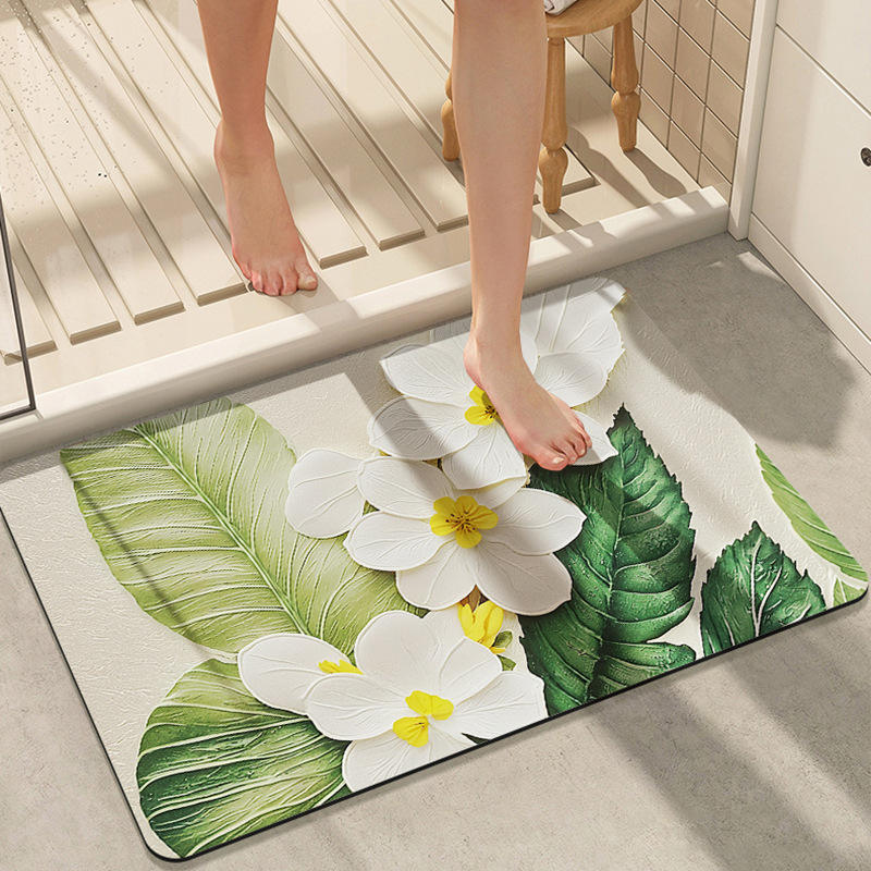 Tapis de salle de bain à motif floral, absorbant, en cuir, rectangulaire, design moderne, pour l'entrée de la salle de bain, antidérapant, vert et blanc
