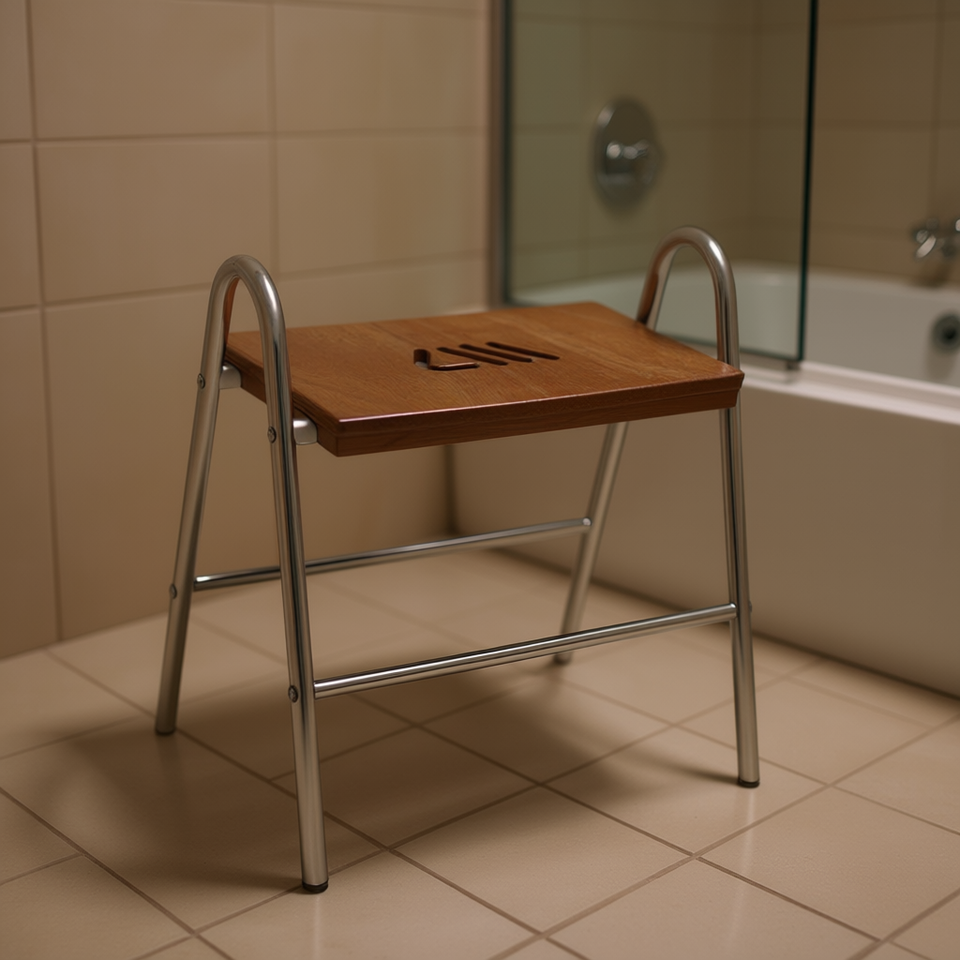 Tabouret de salle de bain en bois avec structure en acier chromé, longueur 43,4 cm, largeur 57,7 cm, hauteur 10 cm, équipement de sécurité