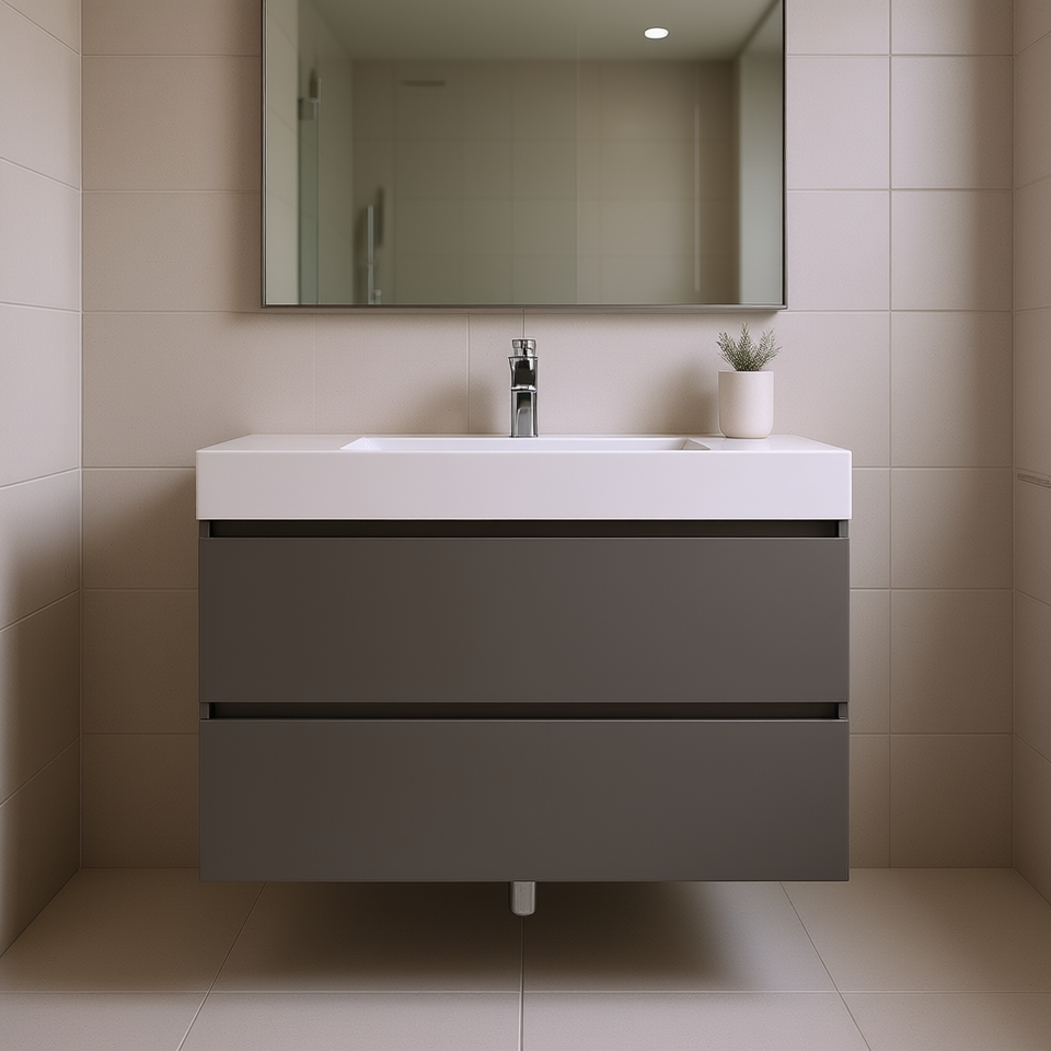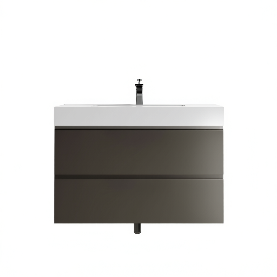 Meuble-lavabo de salle de bain 36 pouces gris moderne mural flottant avec vasque monobloc blanche et drain noir mat