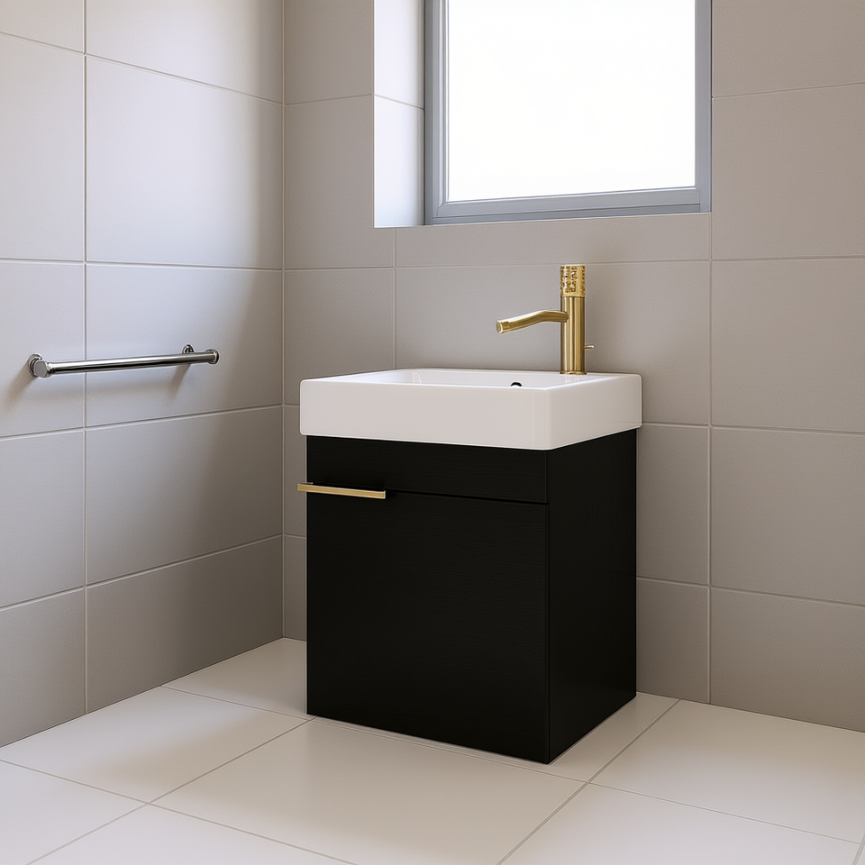 Meuble-lavabo de salle de bain avec vasque 16 pouces, fermeture douce, finition moderne foncée pour petites salles de bain