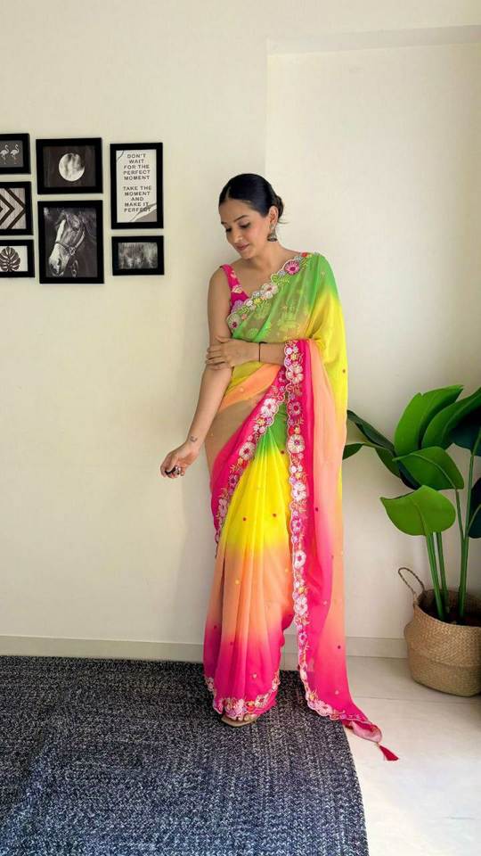 Fête à la plage et fonction spéciale couleur vive broderie riche Pallu travail Style moderne fantaisie Saree avec chemisier assorti pièce