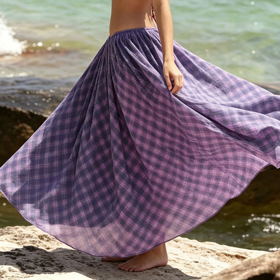 Jupe longue évasée à taille basse en maille à carreaux color block, taille élastique, drapée, coupe trapèze, pour vacances à la plage