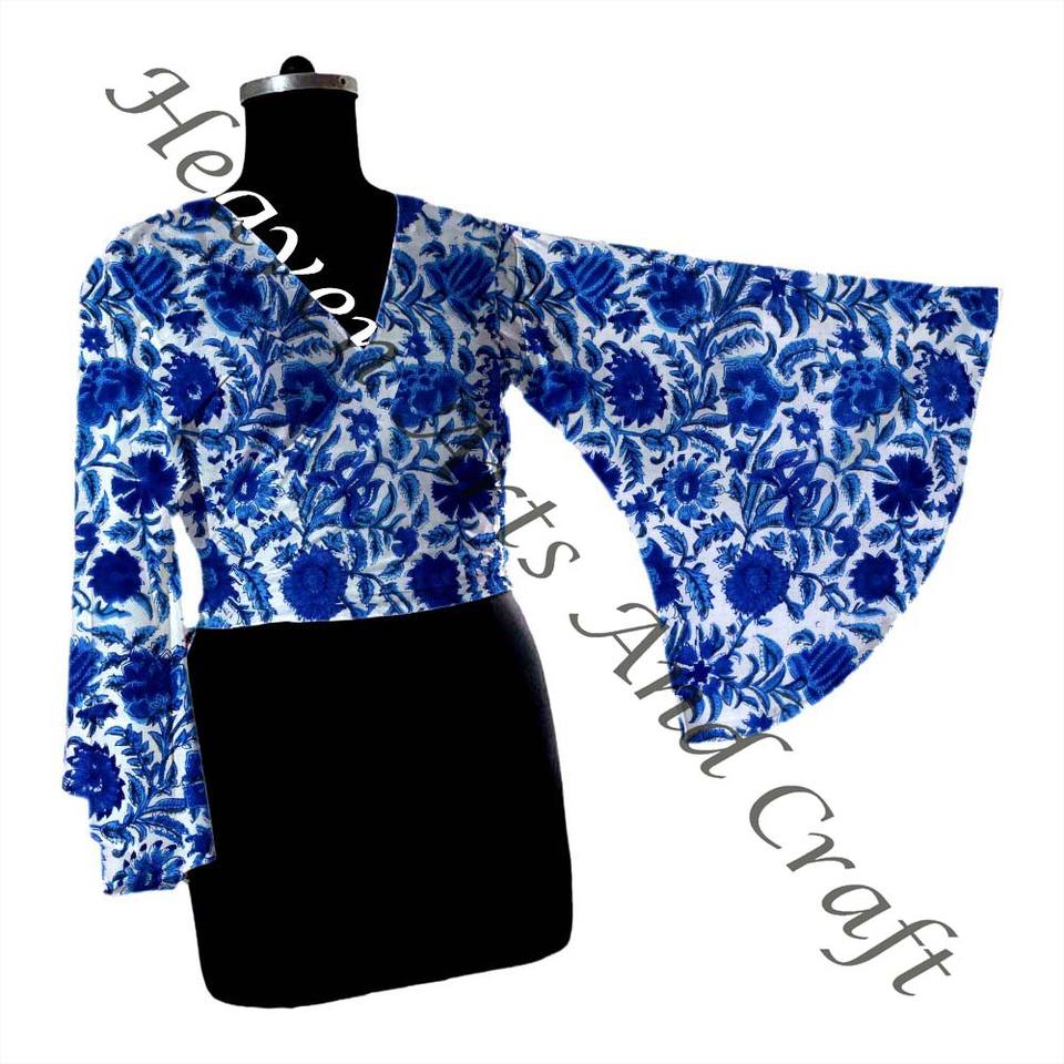 Beach Wear Wrap Tie Top House Wear Short Cotton Tie Top Long Bell Sleeves Gift For Her Short Hand Block Print Top