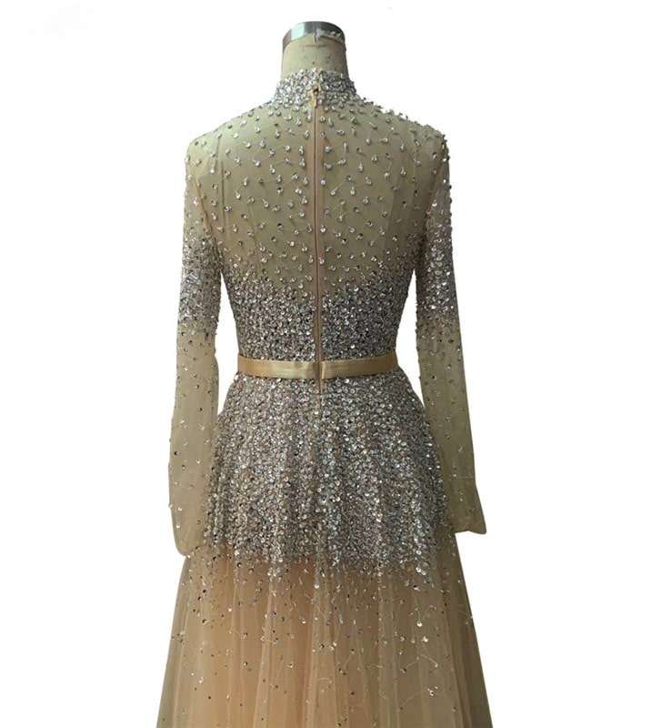 Robe de mariée de luxe à manches longues, col rond, taille empire, longueur au sol, avec perles de cristal et broderies de diamants, soutien-gorge intégré