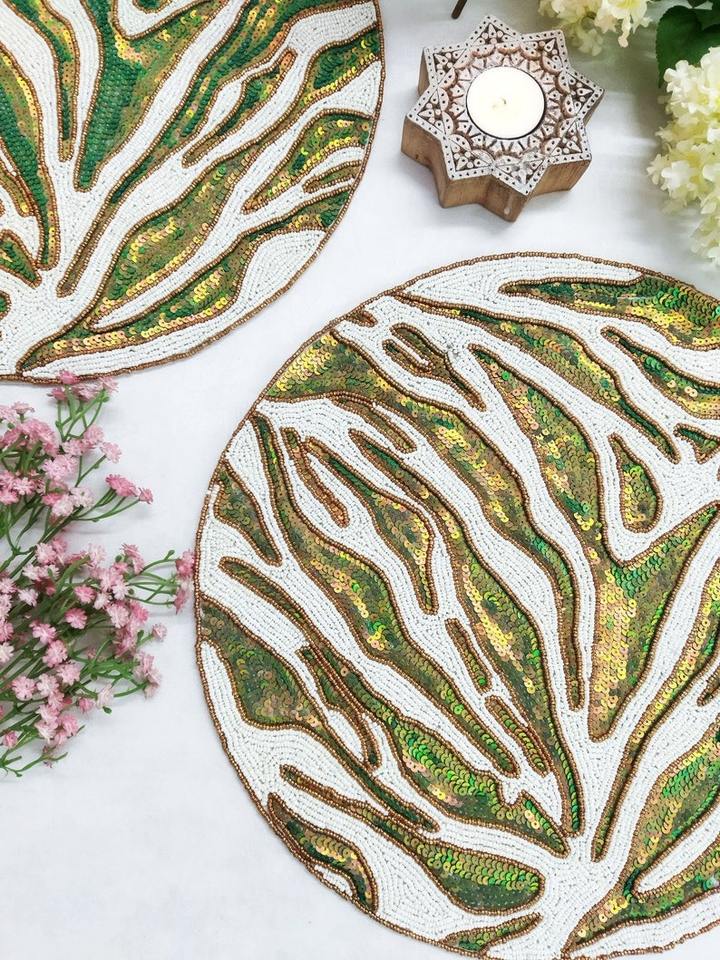 Chemin de table de luxe écologique à fleurs perlées, design unique de fleurs roses et vertes, fait à la main, broderie artisanale, dessous de plat pour la maison