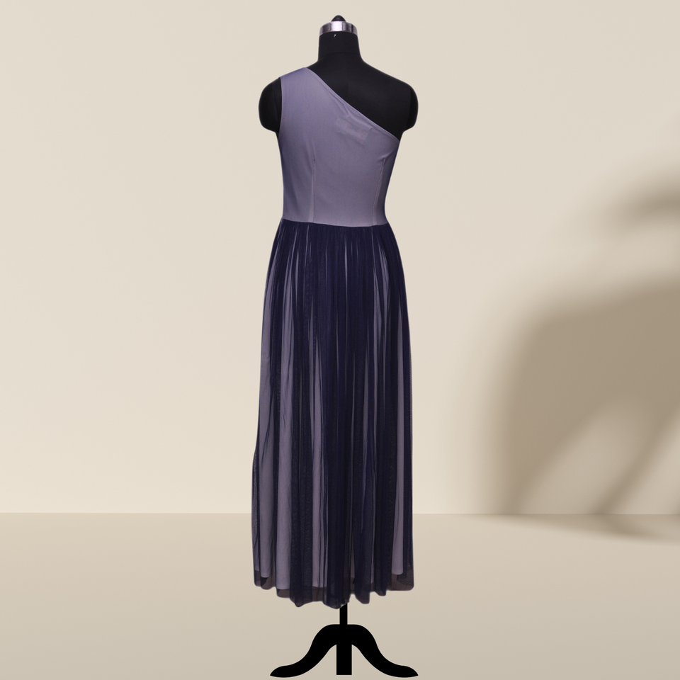 Beaded Navy Blue One Shoulder Hand Embellished Gown for Women with Sheer Net Skirt and Fitted Bodice for Elegant Partywear