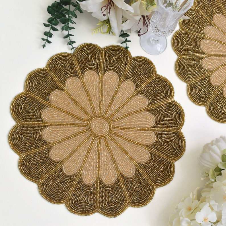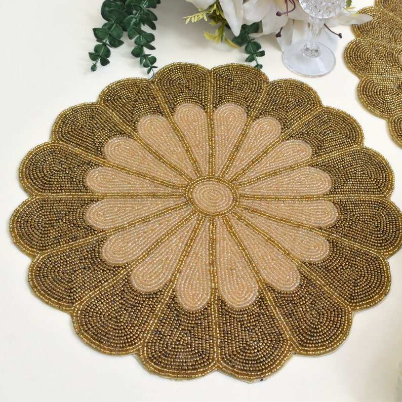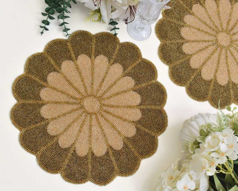 Set de table rond en perles, couleur crème, thème floral, brodé, chemin de table en perles