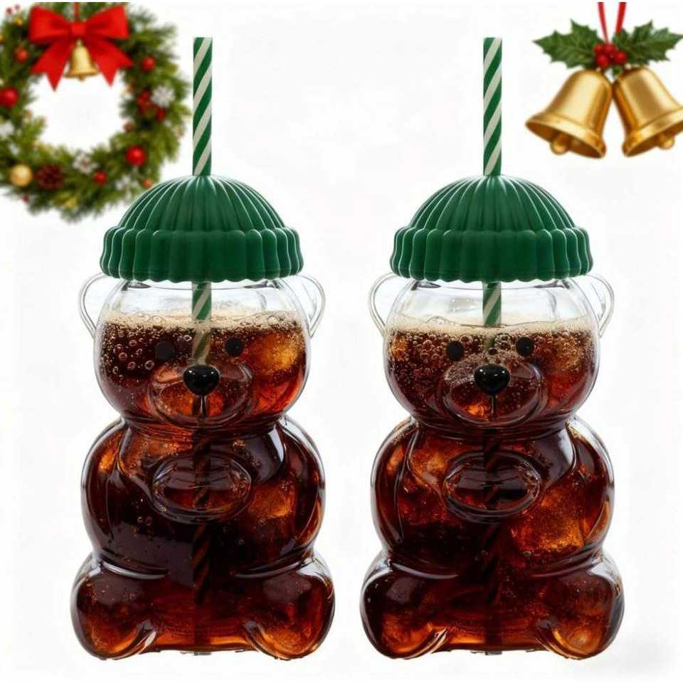 Bear Glass Cup 20oz with Straw, Cute Honey Bear Design with Hat Lid, for Milk Tea Juice Festival Gift