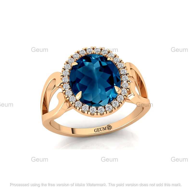Design minimaliste 18k or pur ovale naturel Londres bleu topaze pierres précieuses anneaux Halo réglage diamant bagues de fiançailles en gros