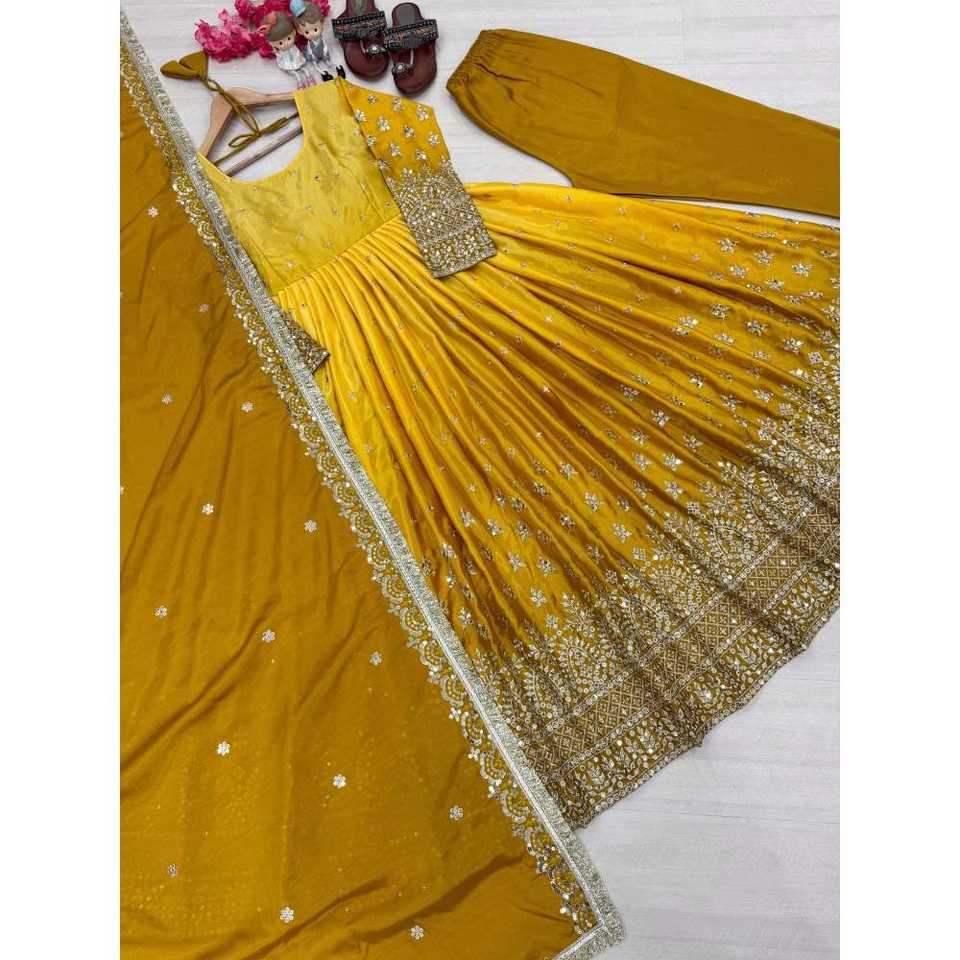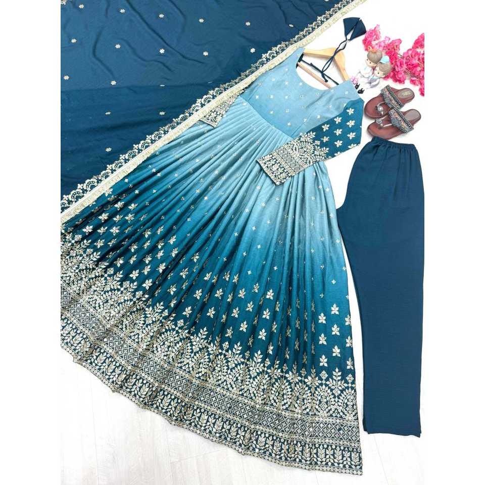 Magnifique ensemble Anarkali avec dupatta et pantalon pour les fêtes, manches longues, tissu en crêpe