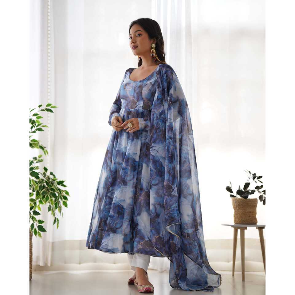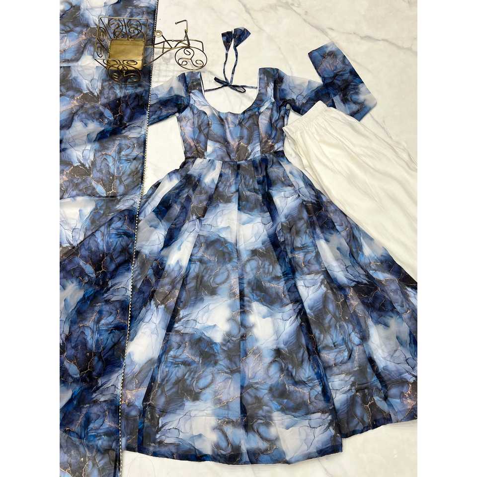 Magnifique robe Anarkali pour les fêtes, style simple, pantalon et dupatta en tissu de chiffon.