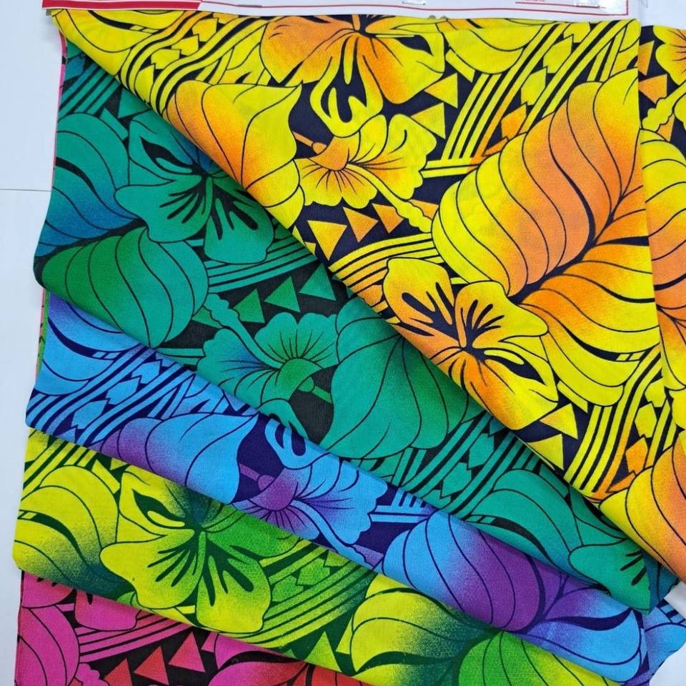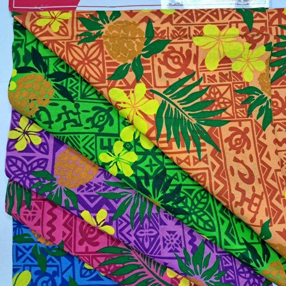 Beaux designs polynésiens colorés et audacieux sur polyester coton 36 pouces de largeur prêts pour expédition immédiate