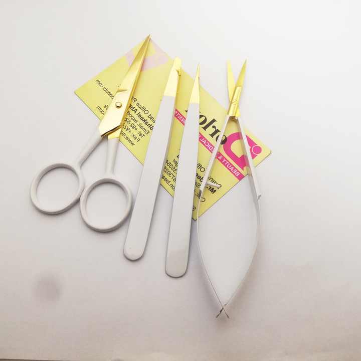 Belle pince à sourcils personnalisée avec ciseaux en acier inoxydable enduit de couleur avec pointe plaquée or Meilleur ensemble de pinces à sourcils