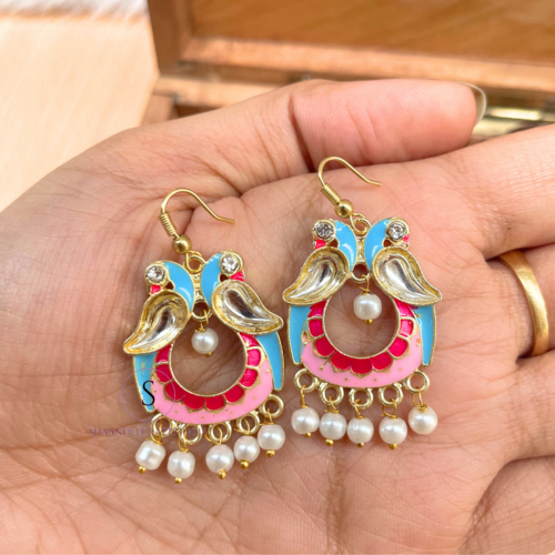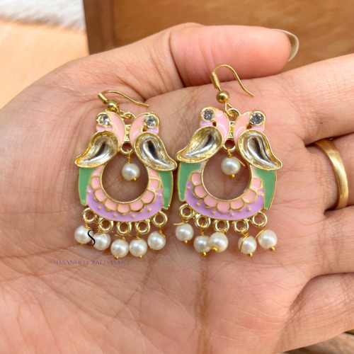 Magnifiques boucles d'oreilles Jhumkaas de créateur avec motifs de perles et d'oiseaux, travail en émail et perles, idéales pour les fêtes.