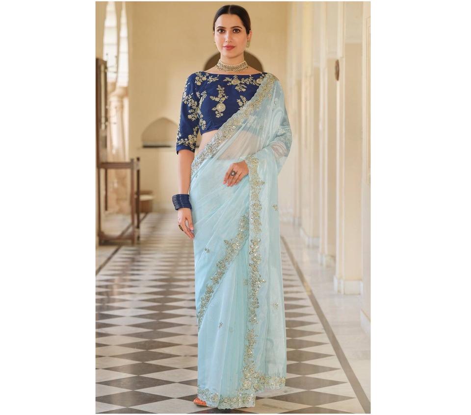 Type:Glace Bleu Couleur Doux Organza Soie Parti Porter Saree