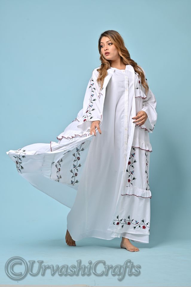 Belle conception de style à volants brodés femmes Abaya Kaftan musulman été taille unique longue longueur réunis dames deux pièces ensemble OEM
