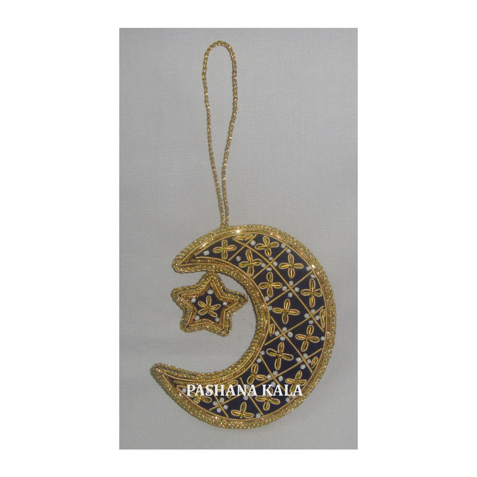 Beaux ornements suspendus en forme de lune et d'étoile à la recherche d'or Zari broderie et ornement suspendu de Noël perlé
