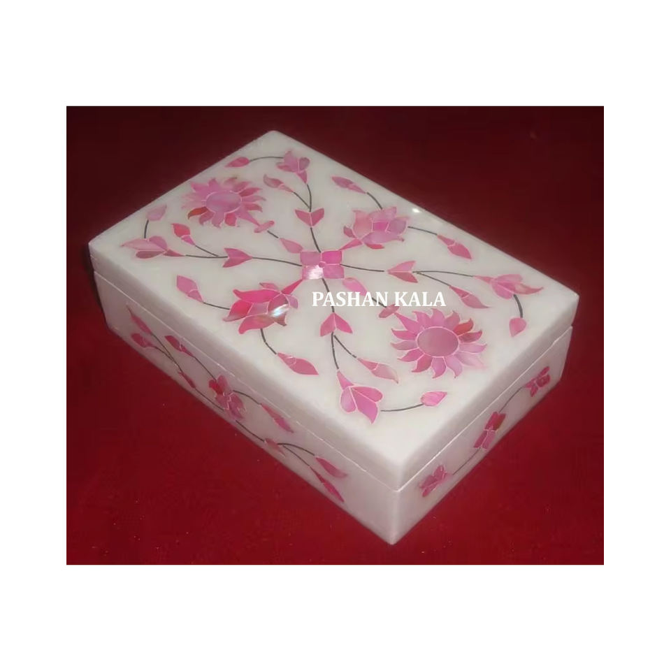 Belle boîte exclusive faite à la main en marbre blanc rose nacre incrustation de cadeaux et de stockage de bijoux au meilleur prix