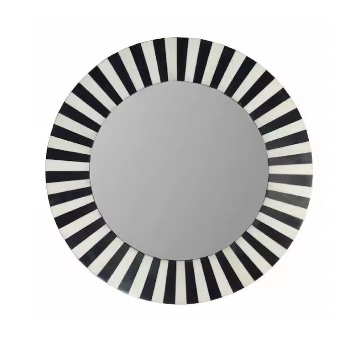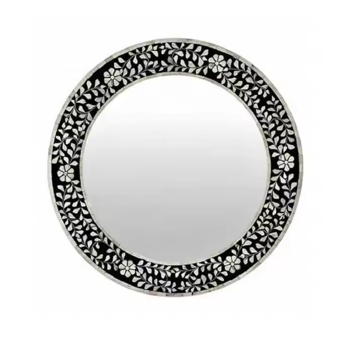 Magnifique miroir mural rond moderne en argent avec incrustations d'os, motif géométrique, décoration de salle de bain par Crescent Crafts