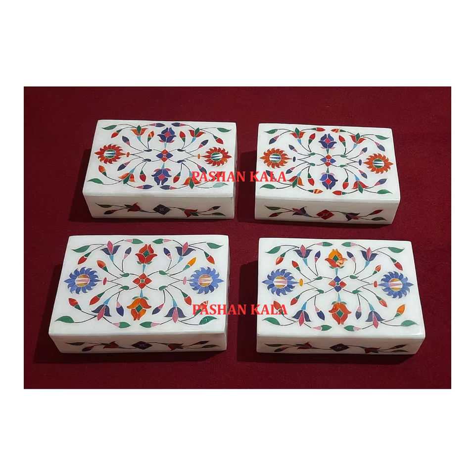 Belle forme rectangulaire en marbre blanc fait à la main avec une finition fine et des boîtes de rangement de bijoux de travail incrustées de fleurs polies