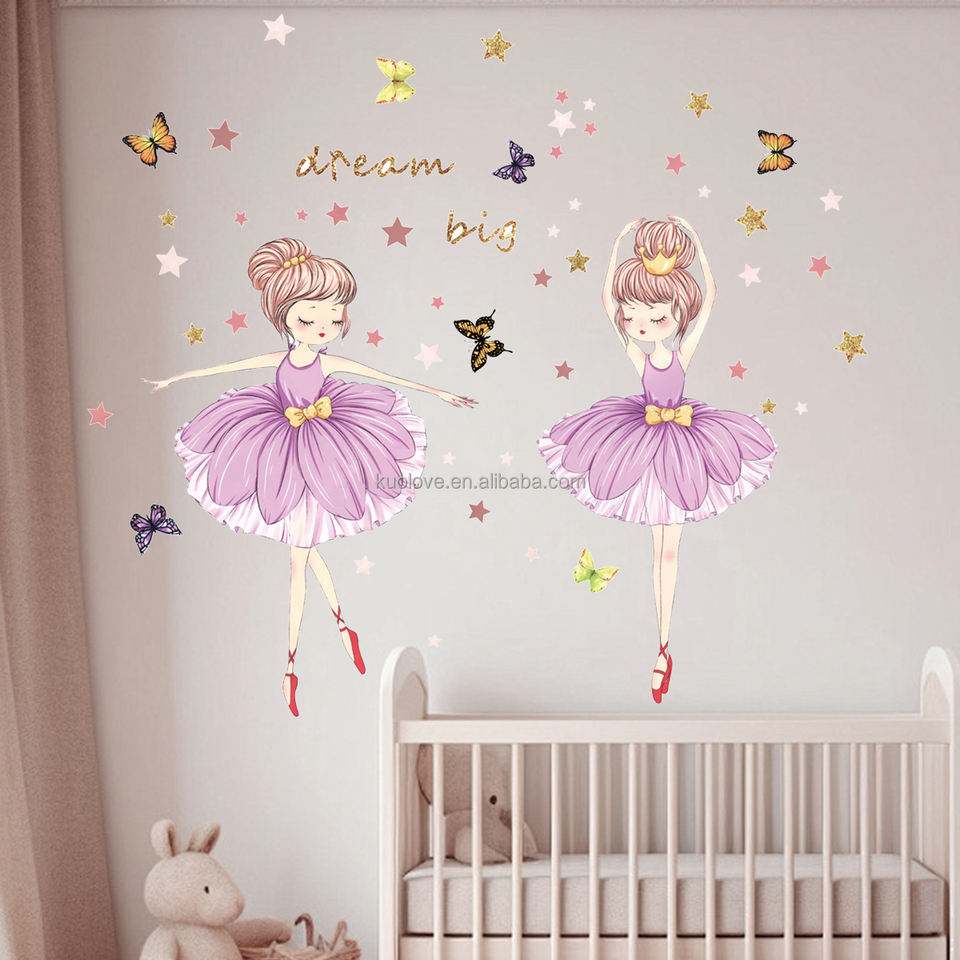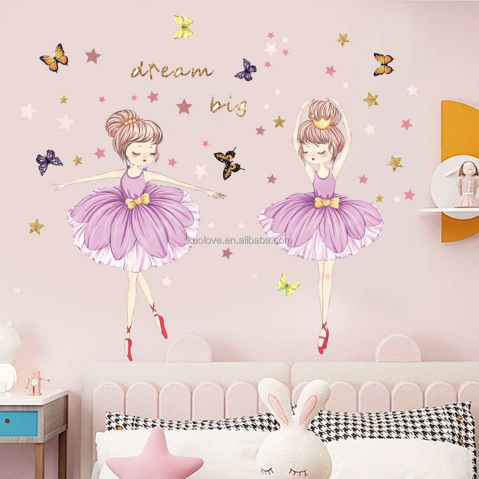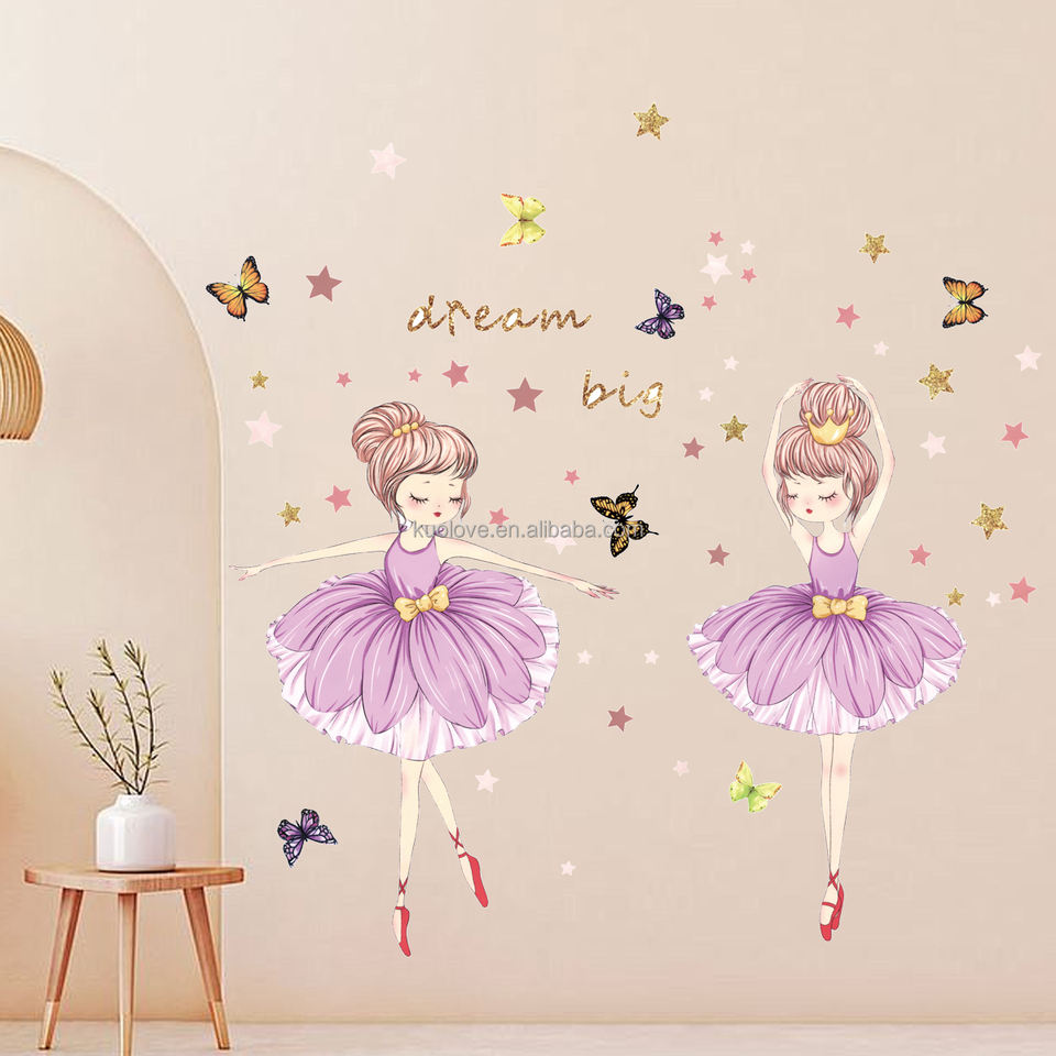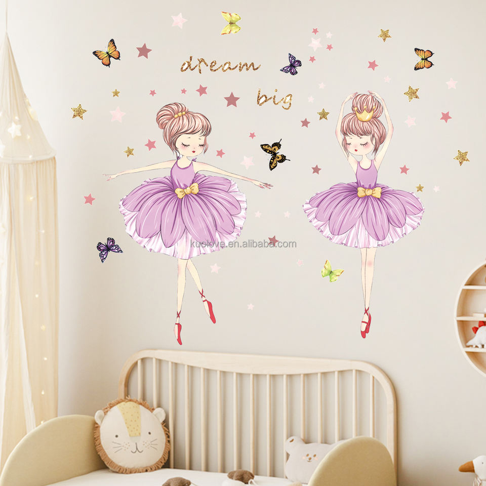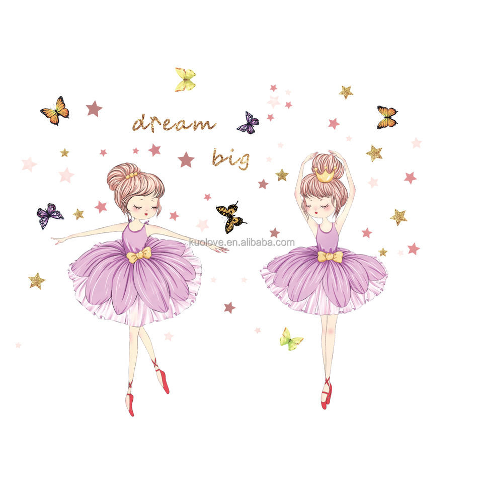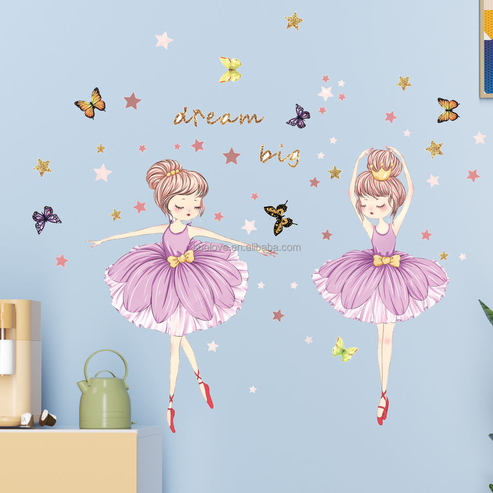 Belle petite fille danse ballet Sticker Mural Papillons étoiles dorées Stickers Salon Papier Peint Décoratif