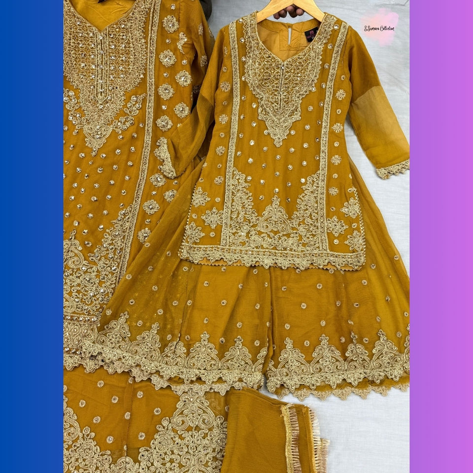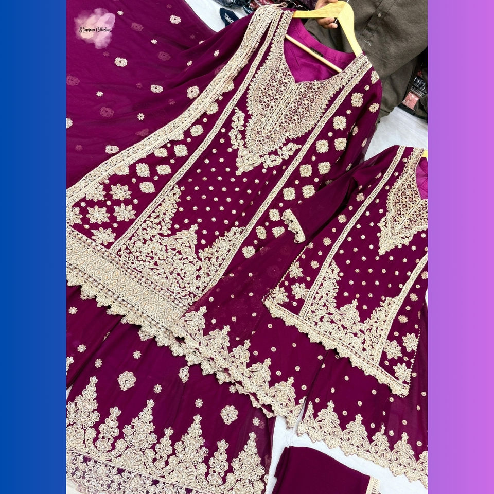 Belle chemise de collection mère fille avec Plazo travail lourd fait à la main sur la chemise et Plazo avec mousseline brodée Dupatta