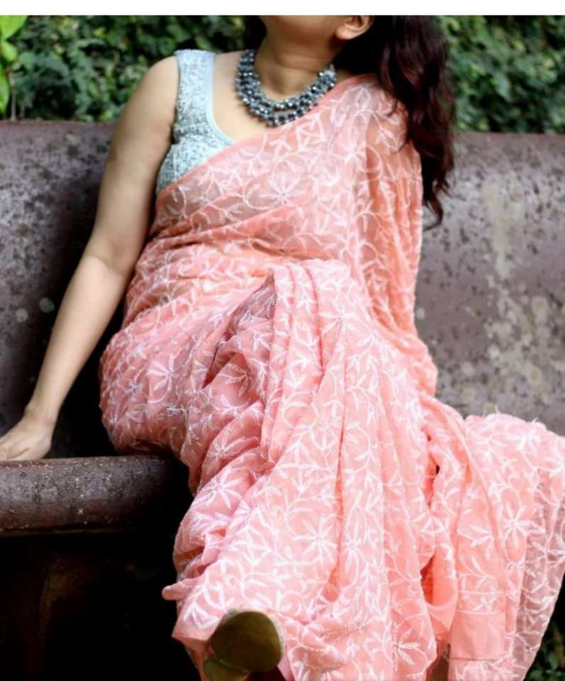 Magnifique Saree en Chiffon avec Broderie Tepchi Intégrale, Fil Blanc, Grande Taille, Blouse 100% Coton pour Festivals et Occasions Spéciales