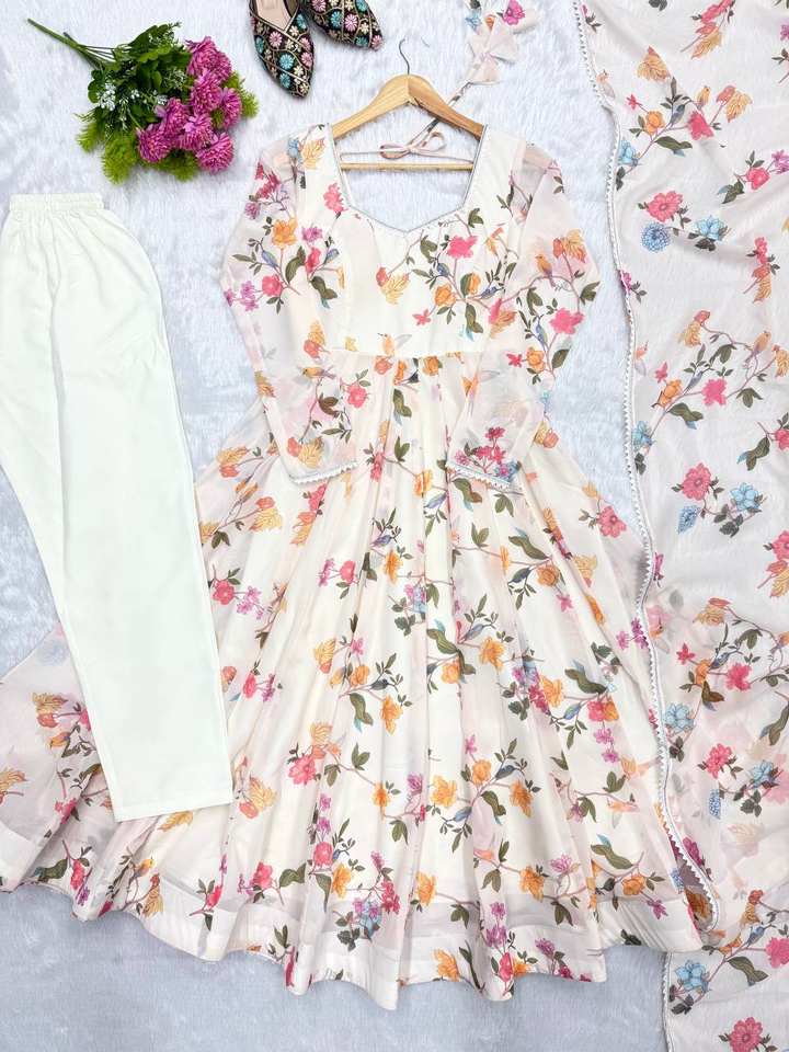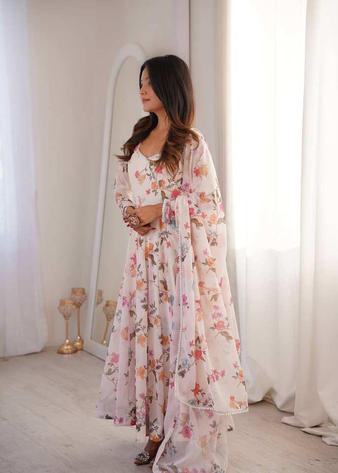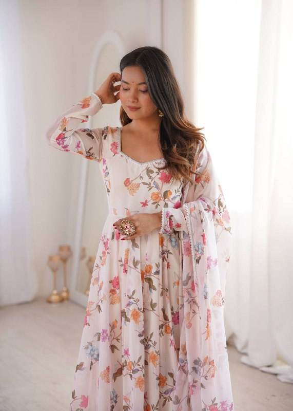 Magnifique robe Anarkali en georgette douce, prête à porter, avec dentelle sur le col, jupe ample et ensemble dupatta.