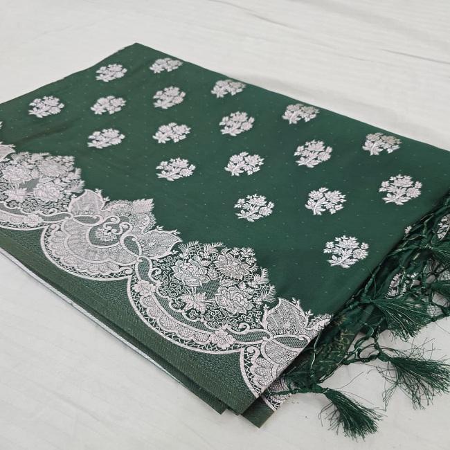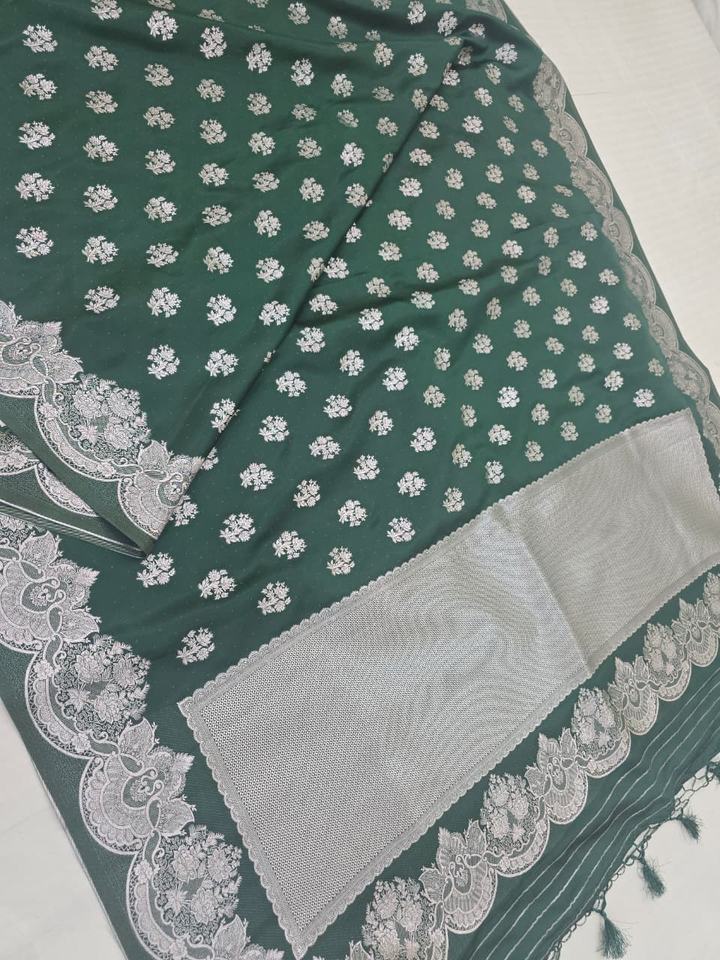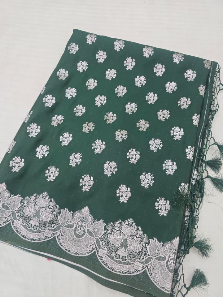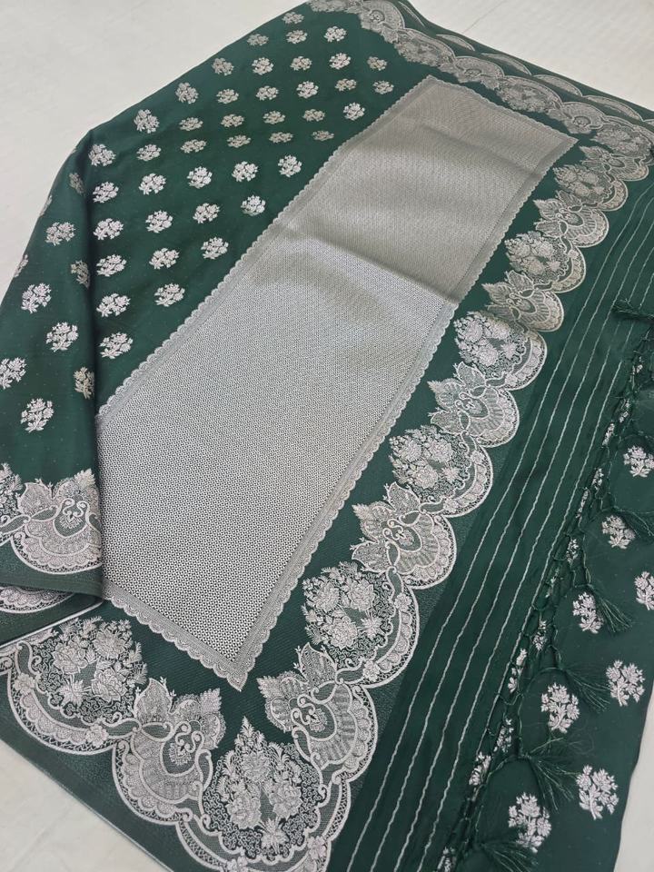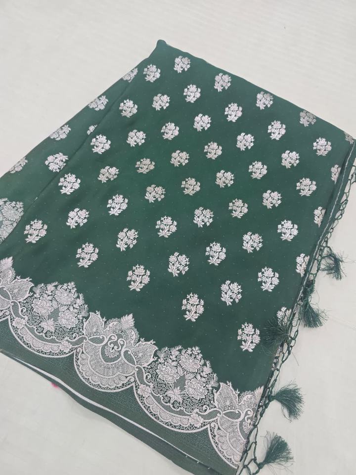 Magnifique Saree en Chiffon Doux et Lisse, Tissé à la Main Traditionnellement, avec Motif Zari Argenté et Bordure Banarasi, Idéal pour les Fêtes et la Protection Solaire
