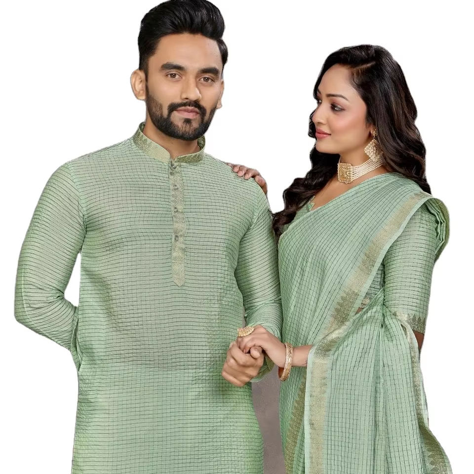 Bel ensemble de couple traditionnel Jari à carreaux en soie avec bordure en jacquard Saree et Kurta ensemble pour couple toutes les occasions parfaites