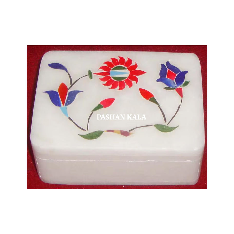 Magnifique boîte à bijoux en marbre blanc avec incrustations et motif floral multicolore, idéale pour les cadeaux de mariage et les cadeaux d'affaires.