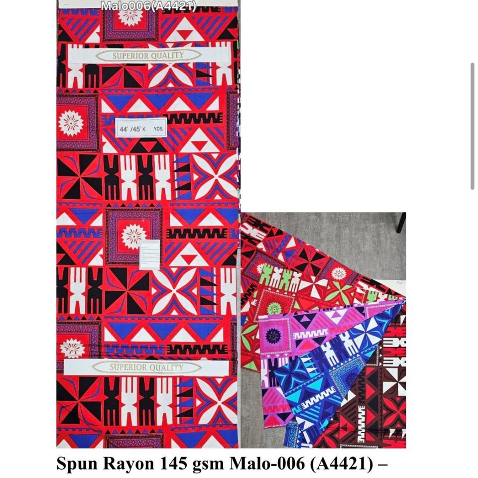 Magnifiques et colorés imprimés abstraits polynésiens hawaïens sur tissu rayonne tissé, largeur 44 pouces, prêts pour une expédition immédiate.