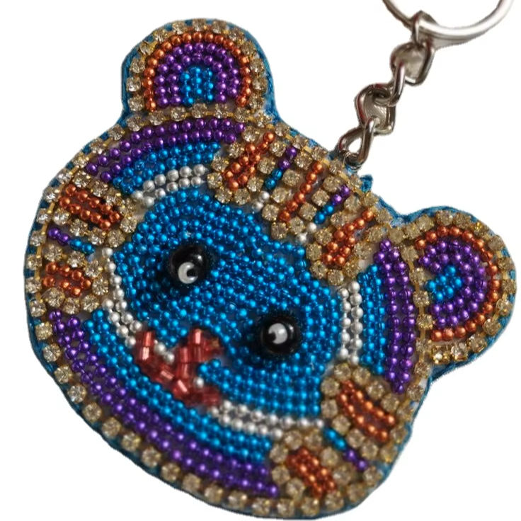 Magnifique porte-clés et accessoires de sac brodés de perles de graines de couleur bleue et rouge avec motif d'ours, en provenance d'Inde