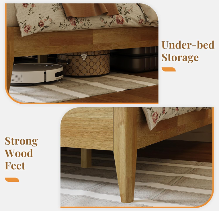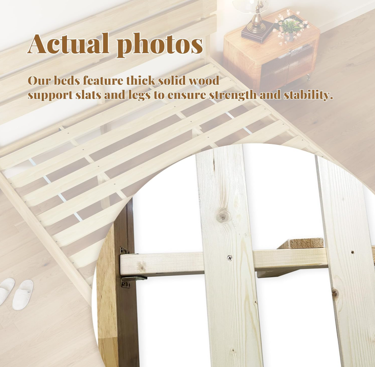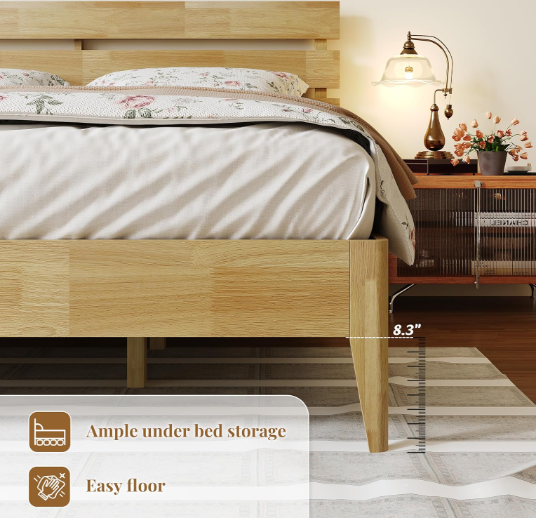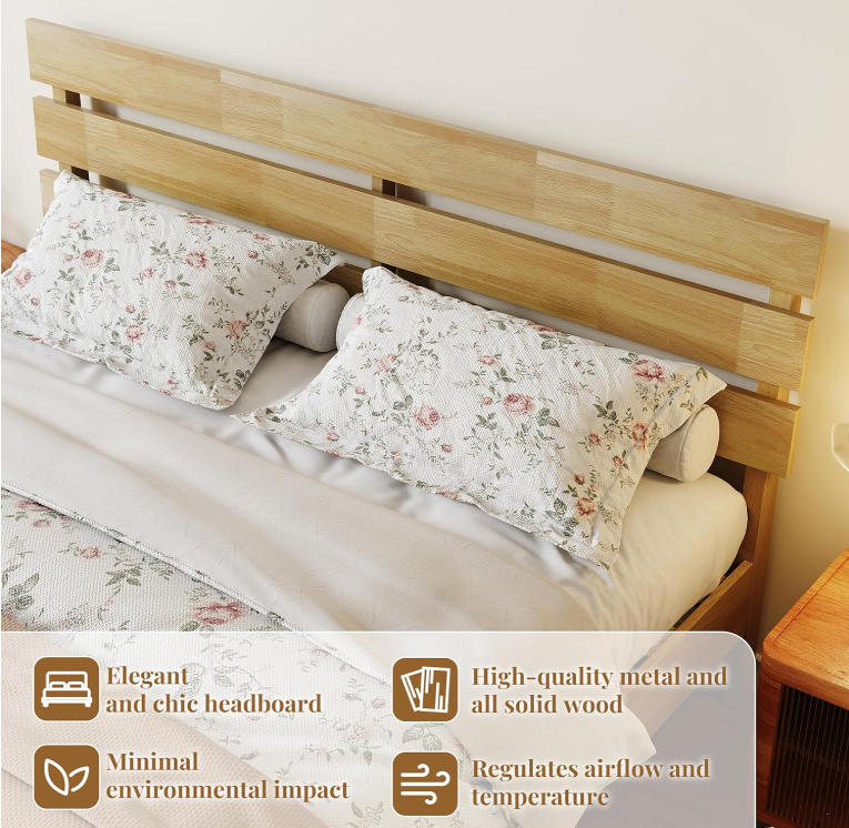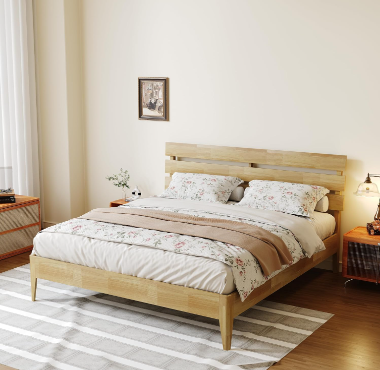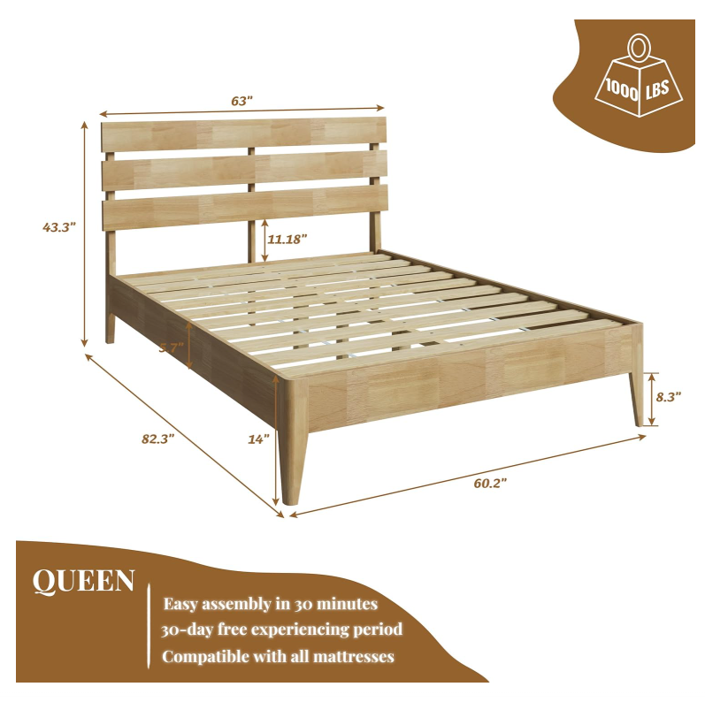 Cadre de lit avec tête de lit, lit plateforme en bois massif de style moderne du milieu du siècle avec pieds en bois massif et support à lattes en bois