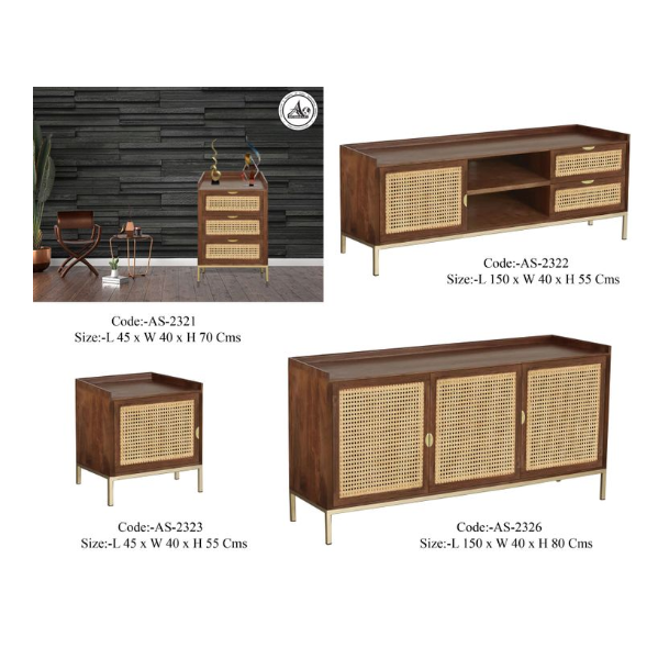 Chevet à 3 tiroirs en bois de manguier massif finition marron et base en rotin et fer métallique finition dorée
