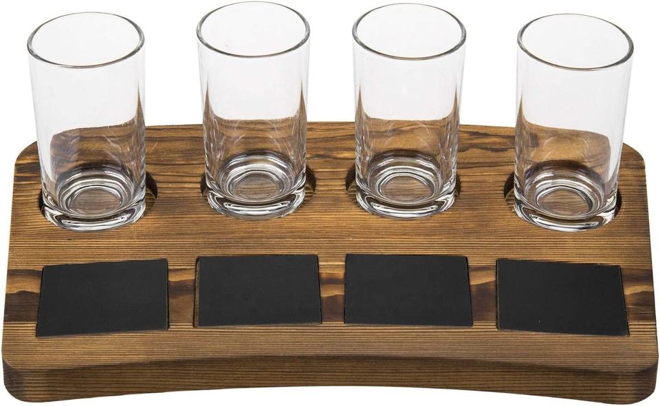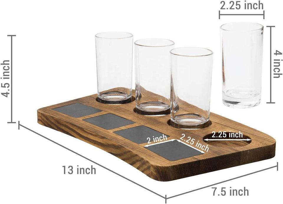 Ensemble d'échantillonnage de vol de dégustation de bière-quatre verres de Pub Pilsner de 6 oz et plateau de service en bois brun foncé