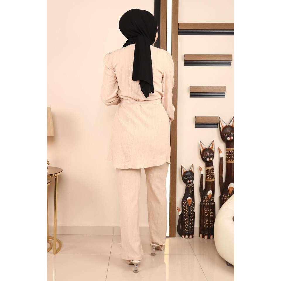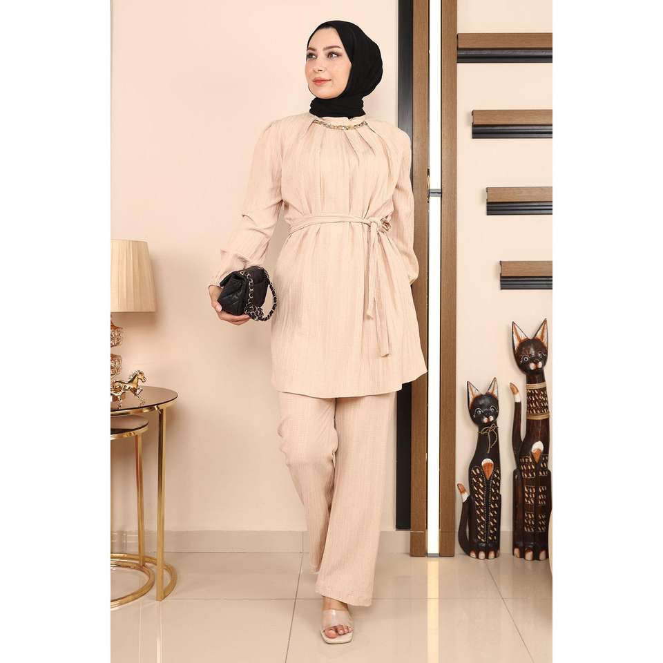 Ensemble 2 pièces beige MSW19140-3 – Hauts décontractés à col rond et longueur midi avec détail chaîne, 100 % polyester, nouveau style
