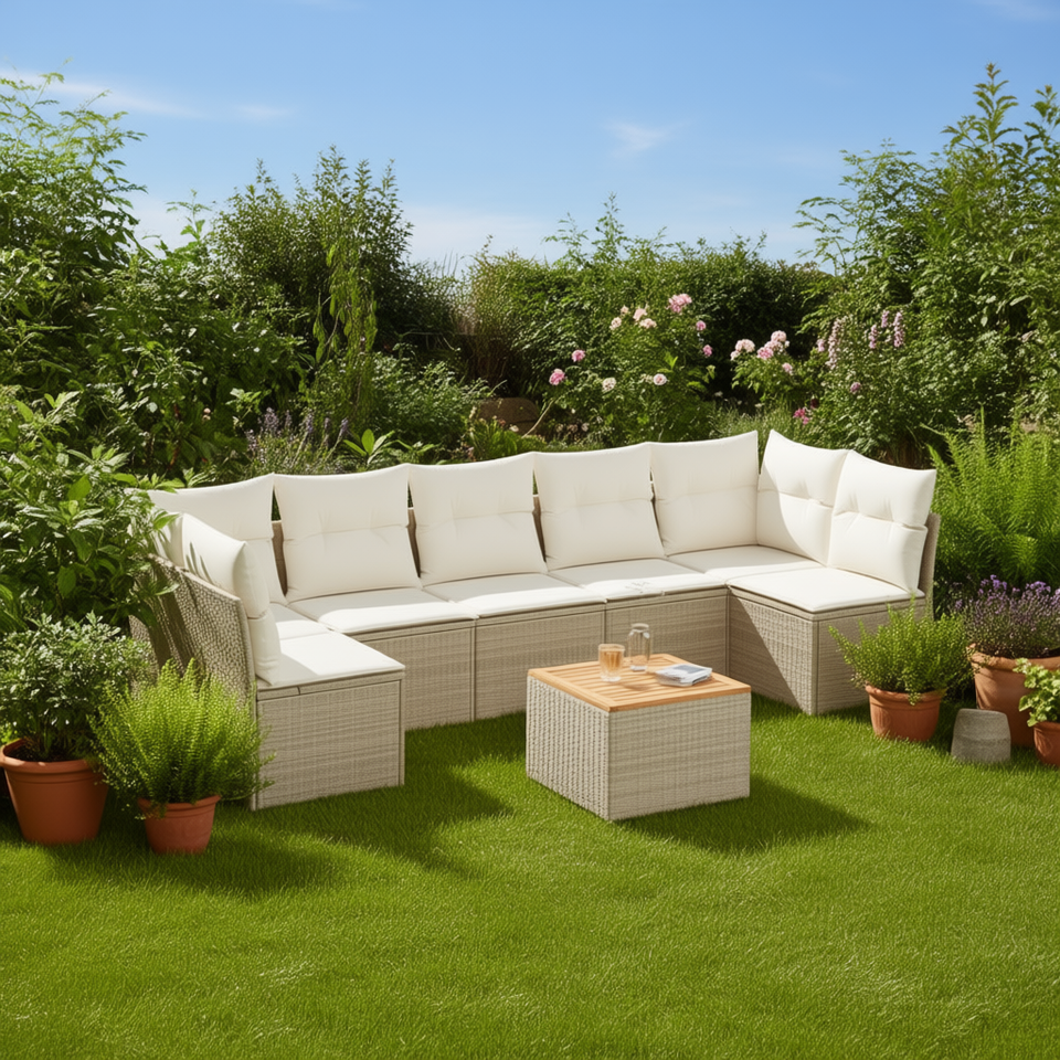 Ensemble de canapés de jardin en rotin beige, coussins en mousse haute densité, mobilier d'extérieur, design contemporain, résistant à l'eau et aux UV