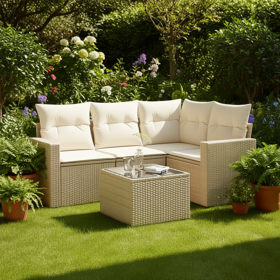 Ensemble de canapés de jardin beige, meubles en rotin d'extérieur avec coussins, design contemporain imperméable