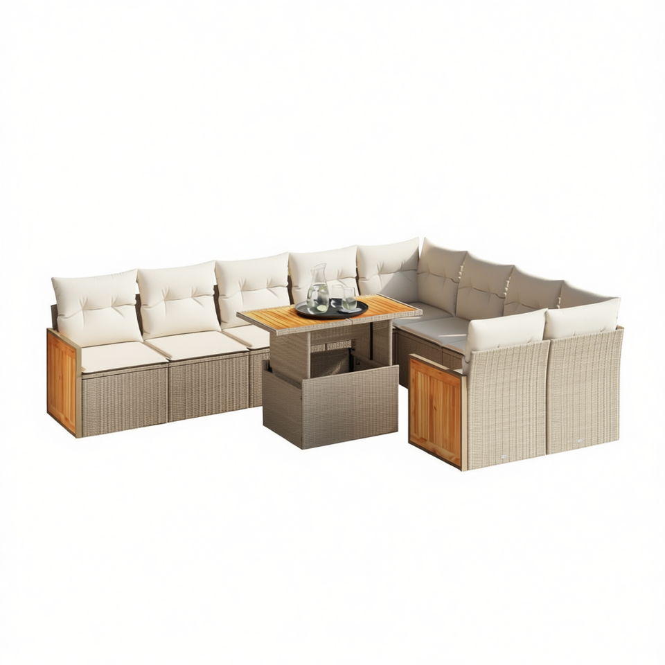 Ensemble de canapés de jardin beige 6 places en rotin, mobilier d'extérieur avec coussins, design contemporain, structure en teck