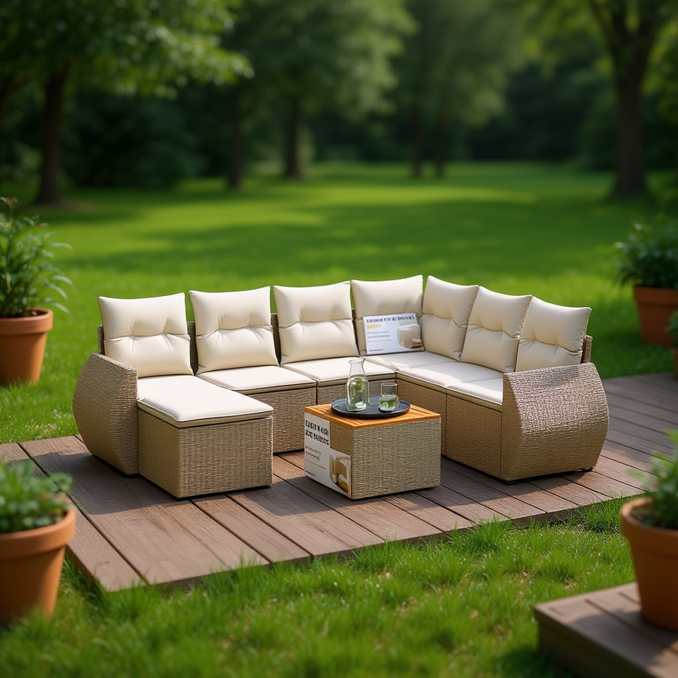 Ensemble de canapés de jardin en rotin beige 6 places, mobilier d'extérieur contemporain résistant aux intempéries, sectionnel pour patio