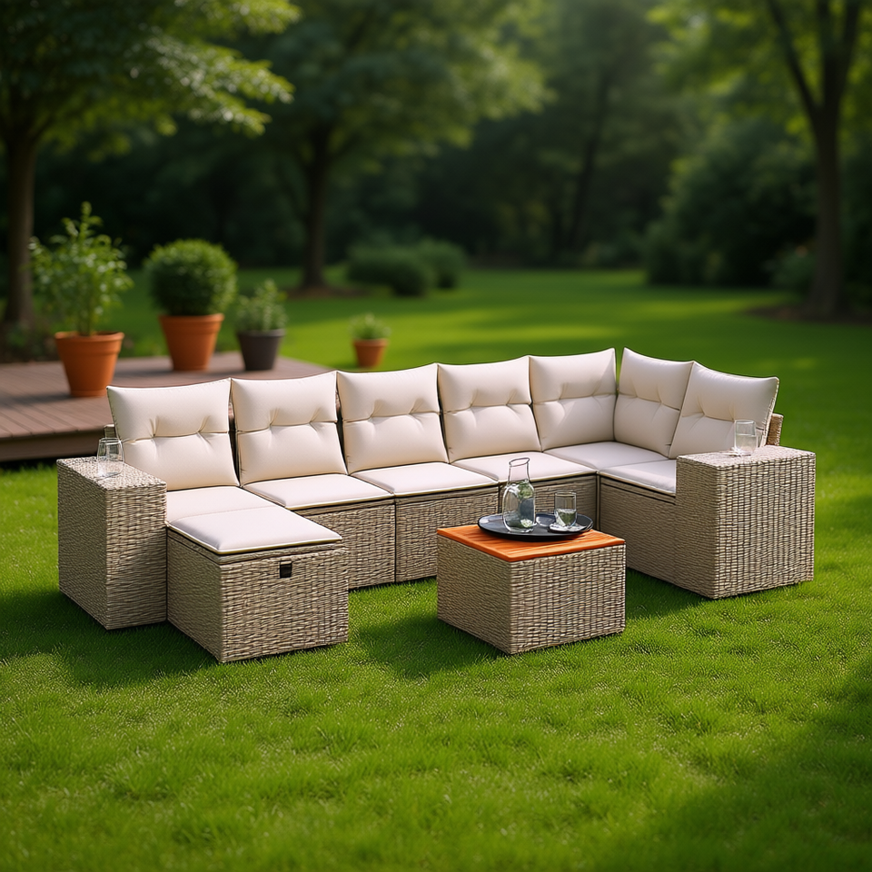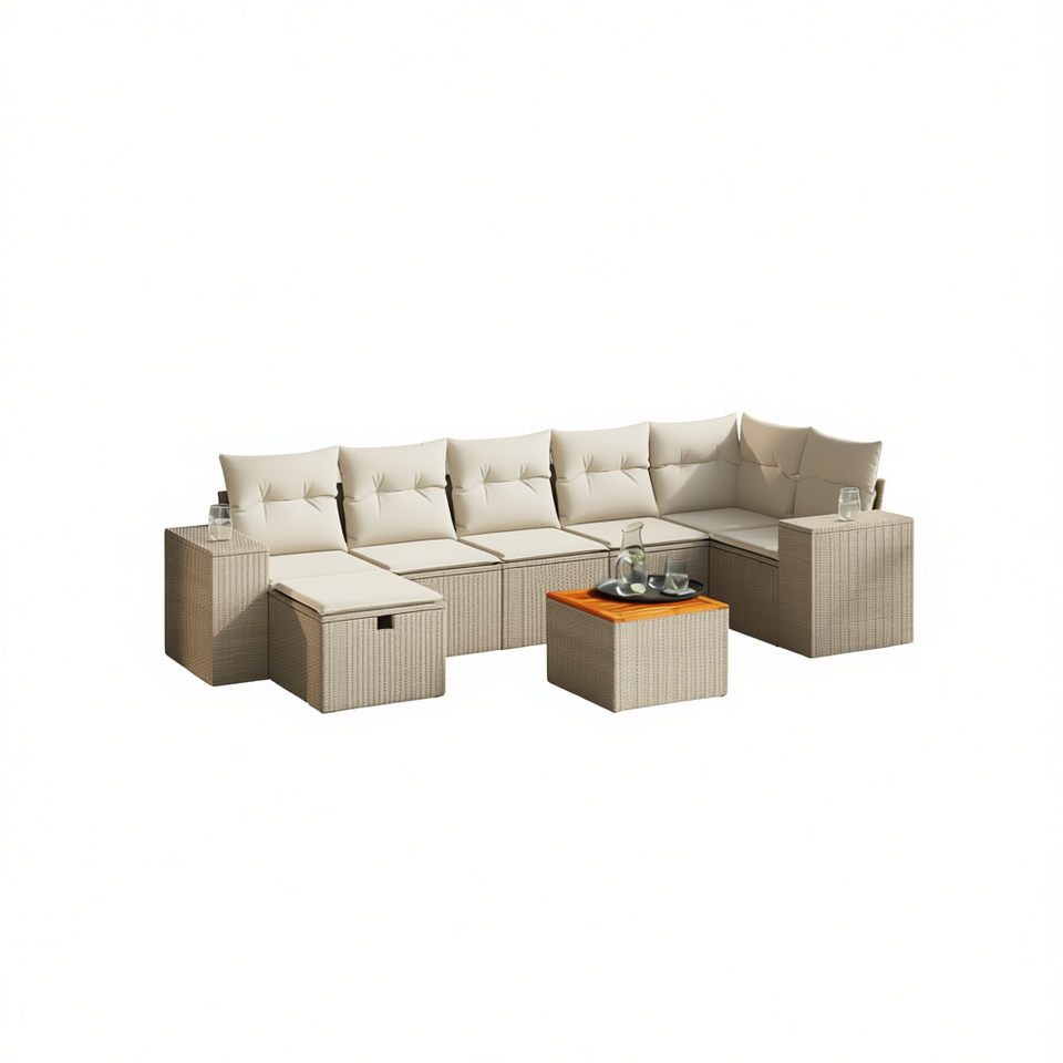 Ensemble de canapés modulaires de jardin en rotin PE beige, meubles d'extérieur confortables avec coussins en mousse haute densité