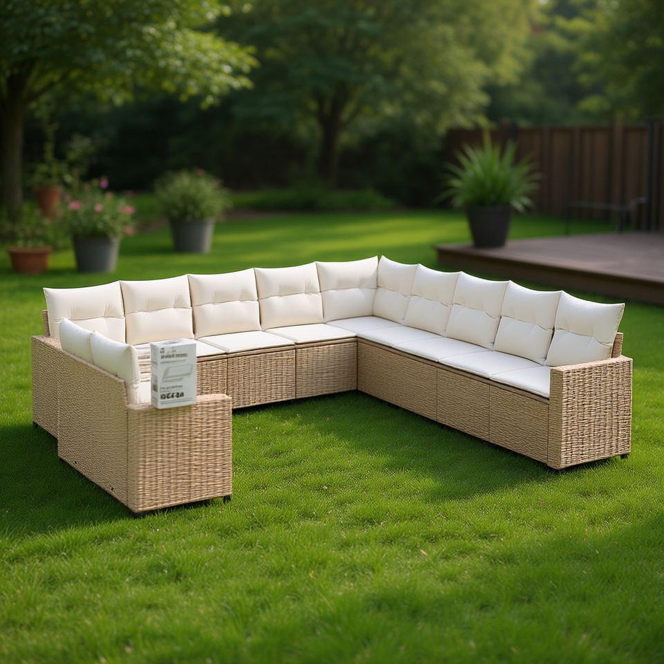 Ensemble de canapés de jardin en rotin beige, 10 places, structure en acier, mobilier d'extérieur, style contemporain, ensemble de jardin durable