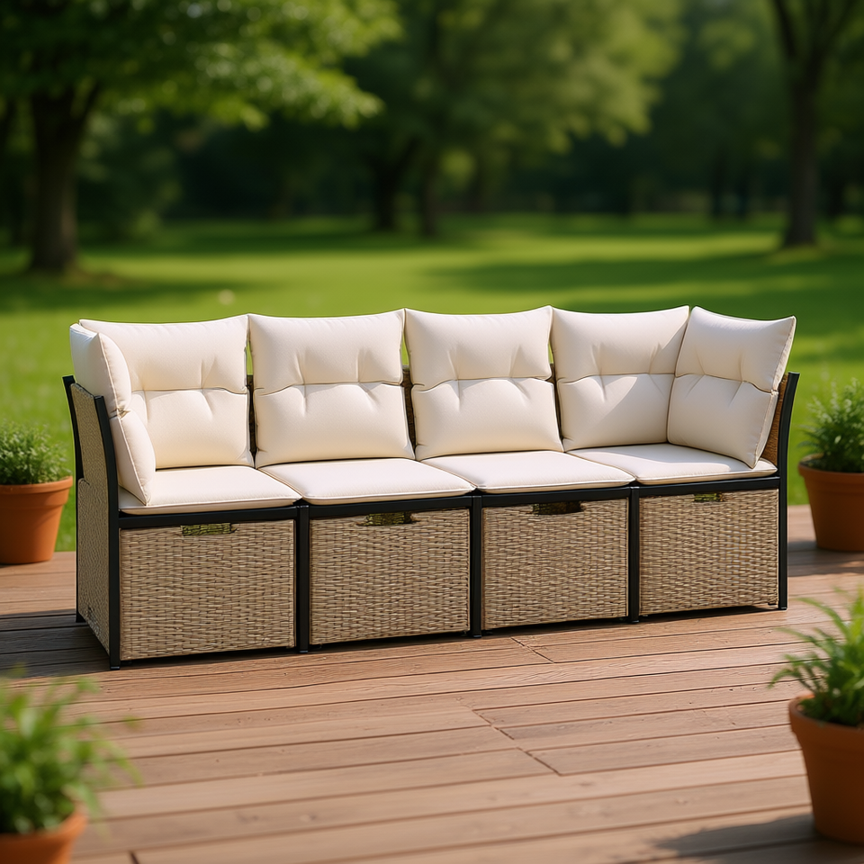 Ensemble de canapés de patio en rotin beige avec structure en acier thermolaqué et coussins en polyester pour usage extérieur 4 places