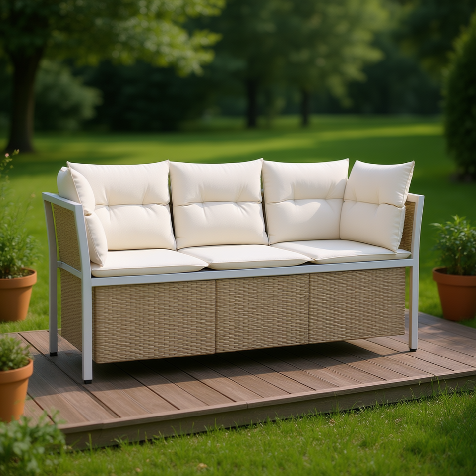 Beige Poly Rattan Garden Sofa Three Seat Outdoor Furniture With Polyester Cushions Modern Design