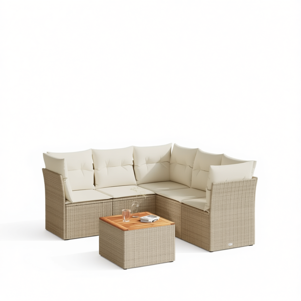 Ensemble de canapés de jardin en rotin beige 6 places, mobilier d'extérieur résistant aux intempéries, design contemporain, plateau en teck