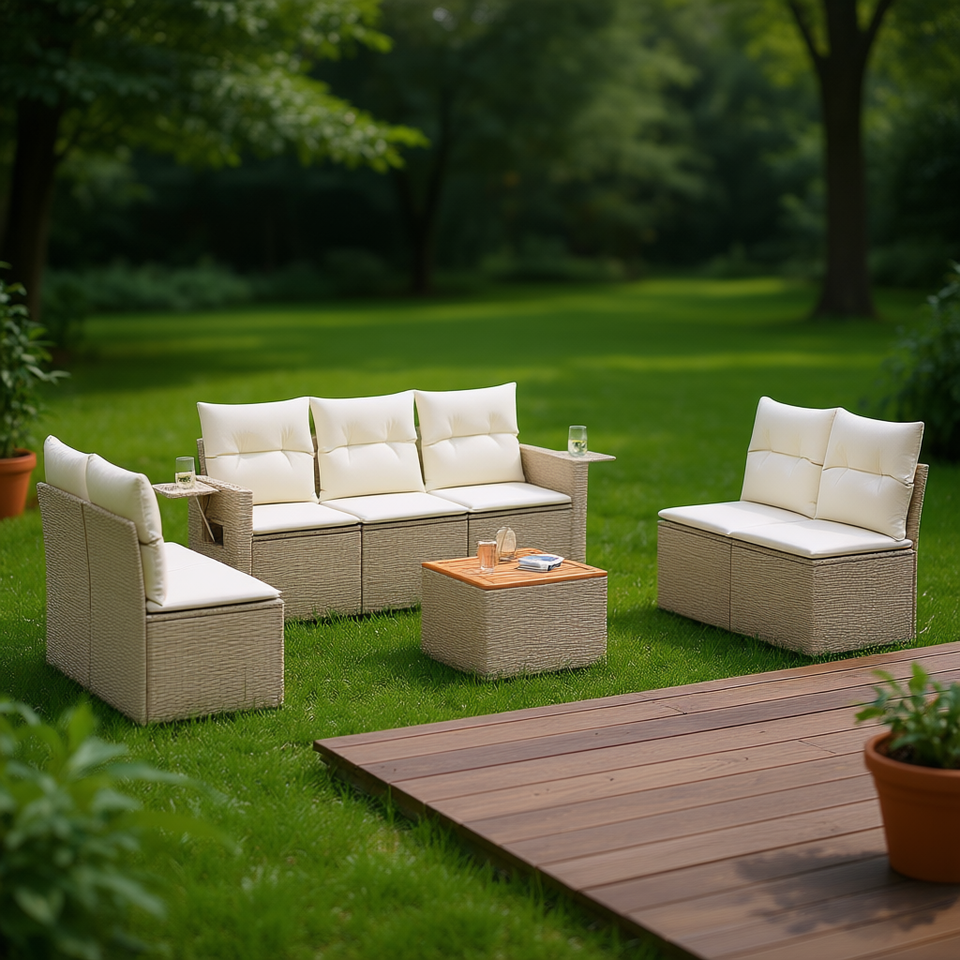Ensemble de canapés de jardin en rotin beige 6 places, mobilier d'extérieur contemporain, structure en osier résistant aux intempéries