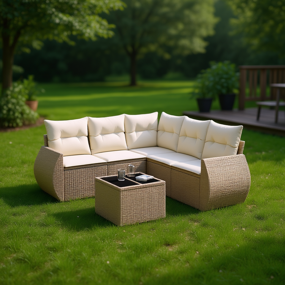 Ensemble de canapés de jardin en rotin beige 6 places, mobilier d'extérieur au design contemporain résistant aux intempéries