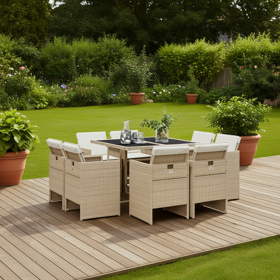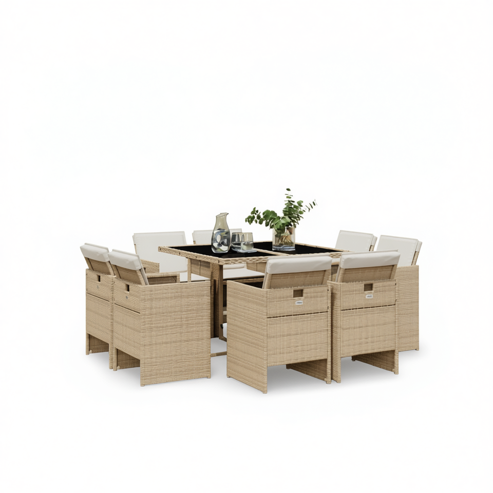 Ensemble de salle à manger de jardin en rotin beige pour 8 personnes, mobilier d'extérieur résistant aux intempéries, design contemporain